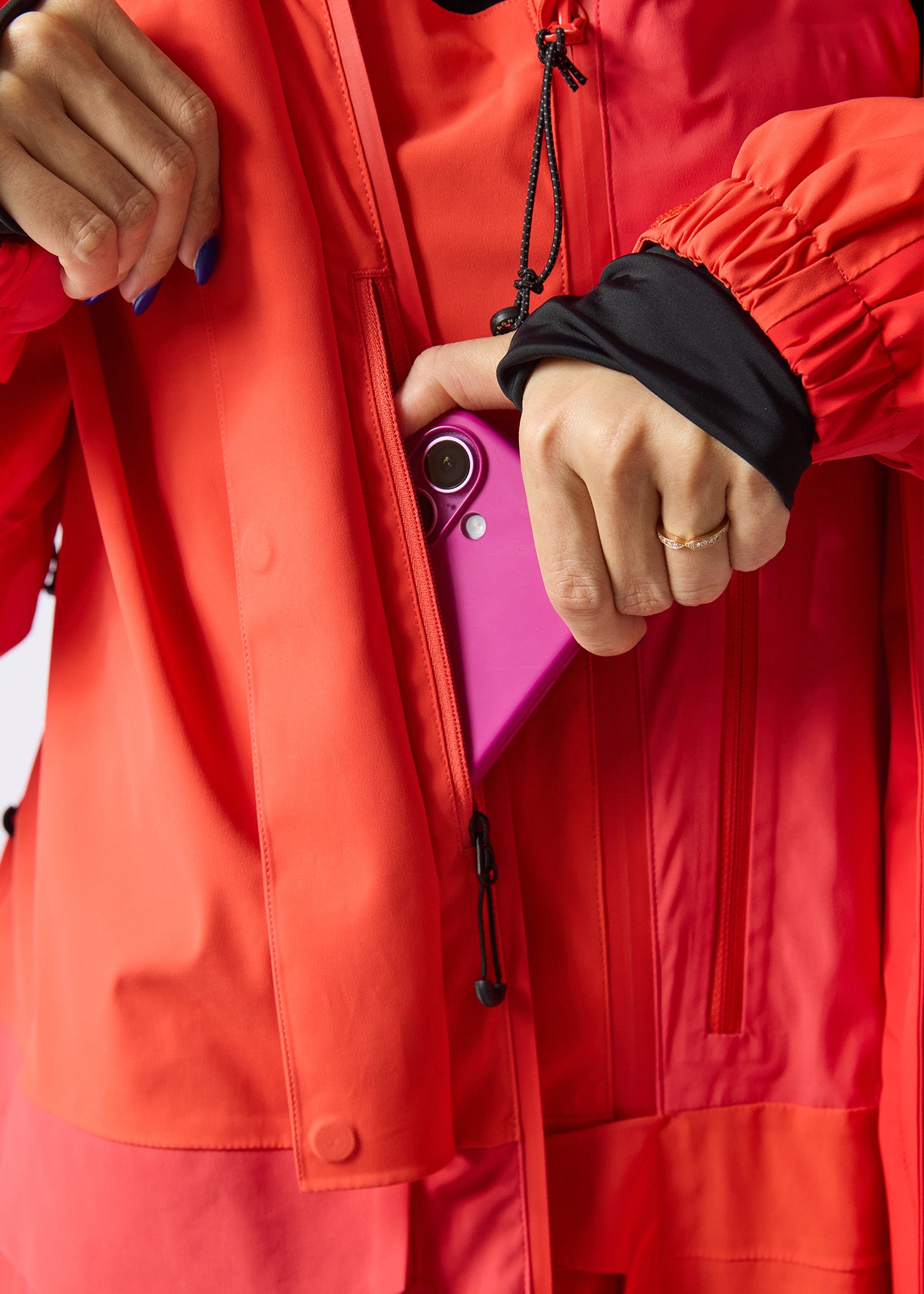 Every major zipper pull on our jacket doubles as a removable hair tie, so you’ll always have one on hand when you need it. These zipper pulls can be quickly removed and used as hair bands, adding a practical, stylish touch to your gear. Perfect for those on-the-go moments when you need to tie your hair back on the slopes.